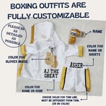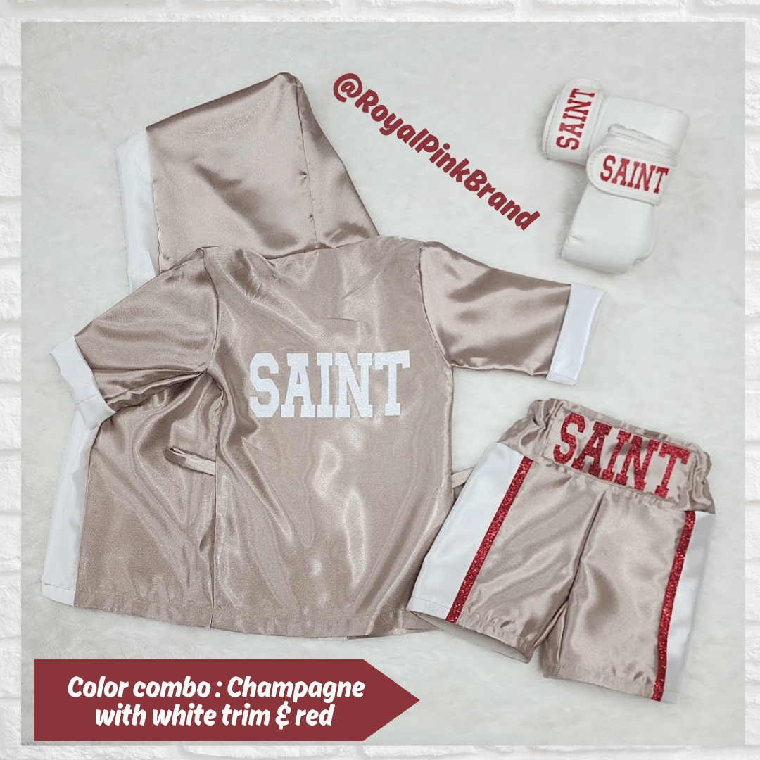 All sets are customized with boxing gloves on the back of the robe with a name.
