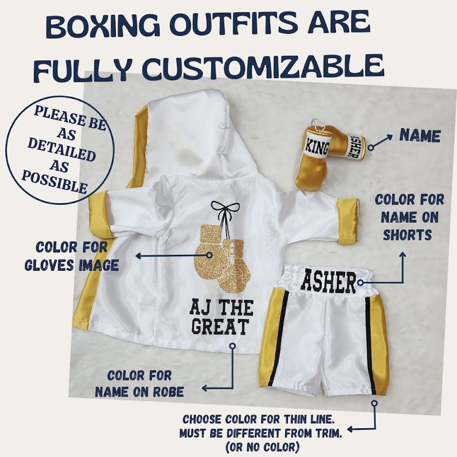 Boxing Gloves and name on the back of robe can be customized in any color. If no color is listed the design will be made in a color combo that matches the boxing set